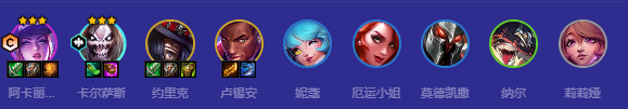 阿卡丽+卡尔萨斯+约里克+卢锡安+妮薏+厄运小姐+莫德凯撒+纳尔+莉莉娅