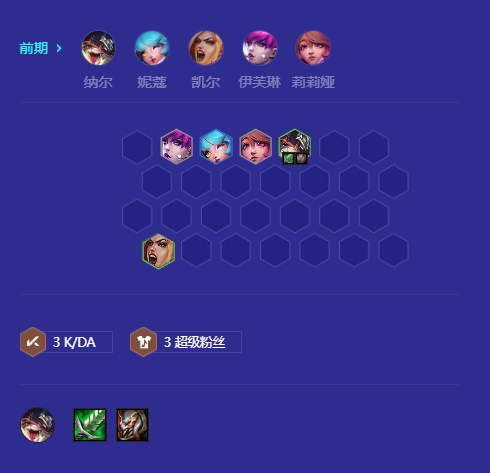 阶段2至阶段3-2,尽量走连胜,装备优先和汲取剑和泰坦,用纳尔带阿卡丽的装备打工最优,凑3超级粉丝3五杀摇滚,可以无压力、高血量过渡到阶段4。