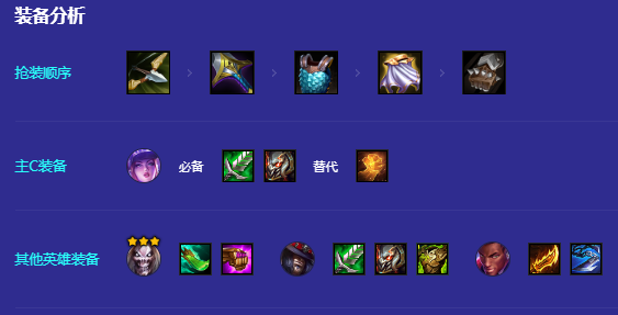 主C阿卡丽带汲取剑、泰坦的坚决必备,第三件看情况给或不给,拿到了天选阿卡丽就不给,超级粉丝会免费给一件成装-正义之手。法装给卡尔萨斯,多余肉装给妮蔻或莫德凯撒。