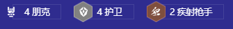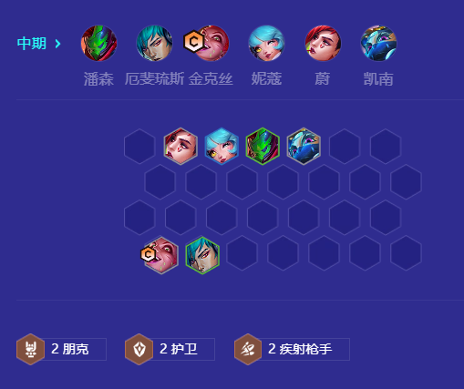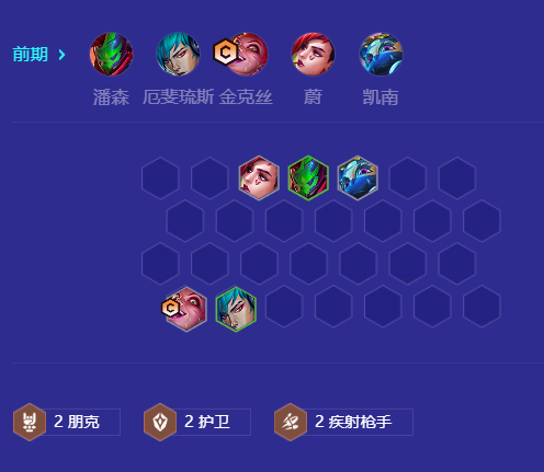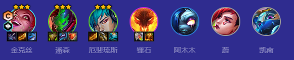 当金克丝三星,即可拉六找三星潘森,三星厄斐琉斯,当潘森三星即可拉7,补锤石开出4护卫阵容即可大成,后期来了约里克可以替换掉阿木木