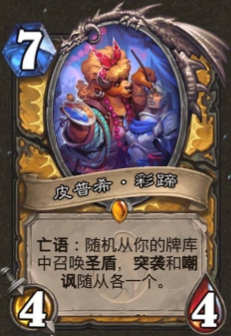 亡语:随机从你的牌库中召唤圣盾,突袭和嘲讽随从各一个。