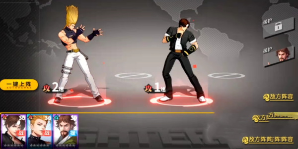 2、阵容搭配:根据敌人的阵容来看,大家需要开场可以提供怒气值的角色。*关相对来说难度较低,系统已经给大家配置好了草薙京和二阶堂红丸进行战斗。